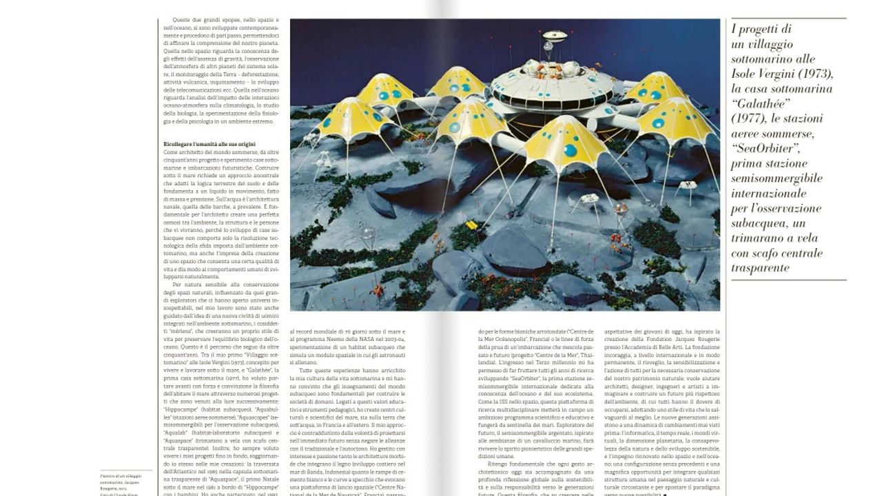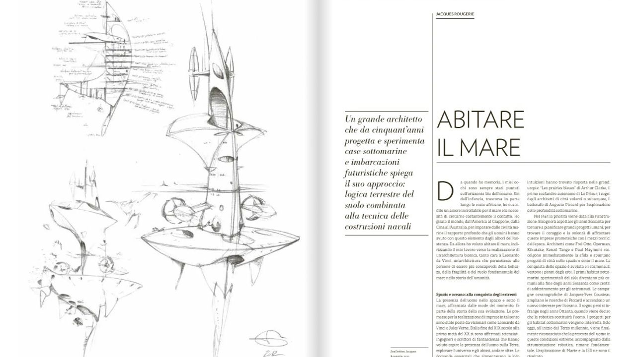 Ce numéro du magazine édité par la Fondazione Leonardo - Civiltà delle Macchine est consacré à un acteur fondamental de la vie contemporaine, encore largement méconnu : le monde sous-marin. Les articles explorent la dimension sous-marine à travers différents éléments, techniques, scientifiques, juridiques et avec une petite revue de sujets humanistes. Grâce à la collaboration avec des chercheurs du CNR et de la Marine, avec lesquels la Fondazione Leonardo-Civiltà delle Macchine a rédigé un rapport sur le sujet, les auteurs illustrent le potentiel économique mais aussi la fragilité environnementale et les éventuels conflits géopolitiques qui pourraient découler de l'exploitation des ressources cachées dans les fonds marins. Outre les aspects technico-scientifiques, les analyses des caractéristiques plus strictement symboliques des fonds marins, en tant que lieu psychologique et de mythe, sont également abordées. Jacques Rougerie a pu partager sa vision et sa passion pour le monde subaquatique à travers son expérience d’explorateur du futur et d’architecte océanographe, mais surtout d’amoureux de la mer. Il est indispensable que tout geste architectural s’accompagne aujourd’hui d’une réflexion globale poussée sur la résilience, la durabilité et la responsabilité envers les générations futures. La nouvelle génération est à la naissance d’une dynamique de changements jamais réunis : l’intelligence artificielle, le temps réel, les univers virtuels, la dimension planétaire, surtout la prise en compte de la nature et du développement durable, les futurs explorations spatiales et océaniques. Cette configuration exceptionnelle est une opportunité magnifique d’intégrer toute structure humaine dans son paysage naturel et culturel environnant, et de changer de paradigme vers d’autres possibles.