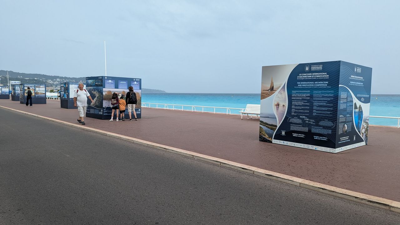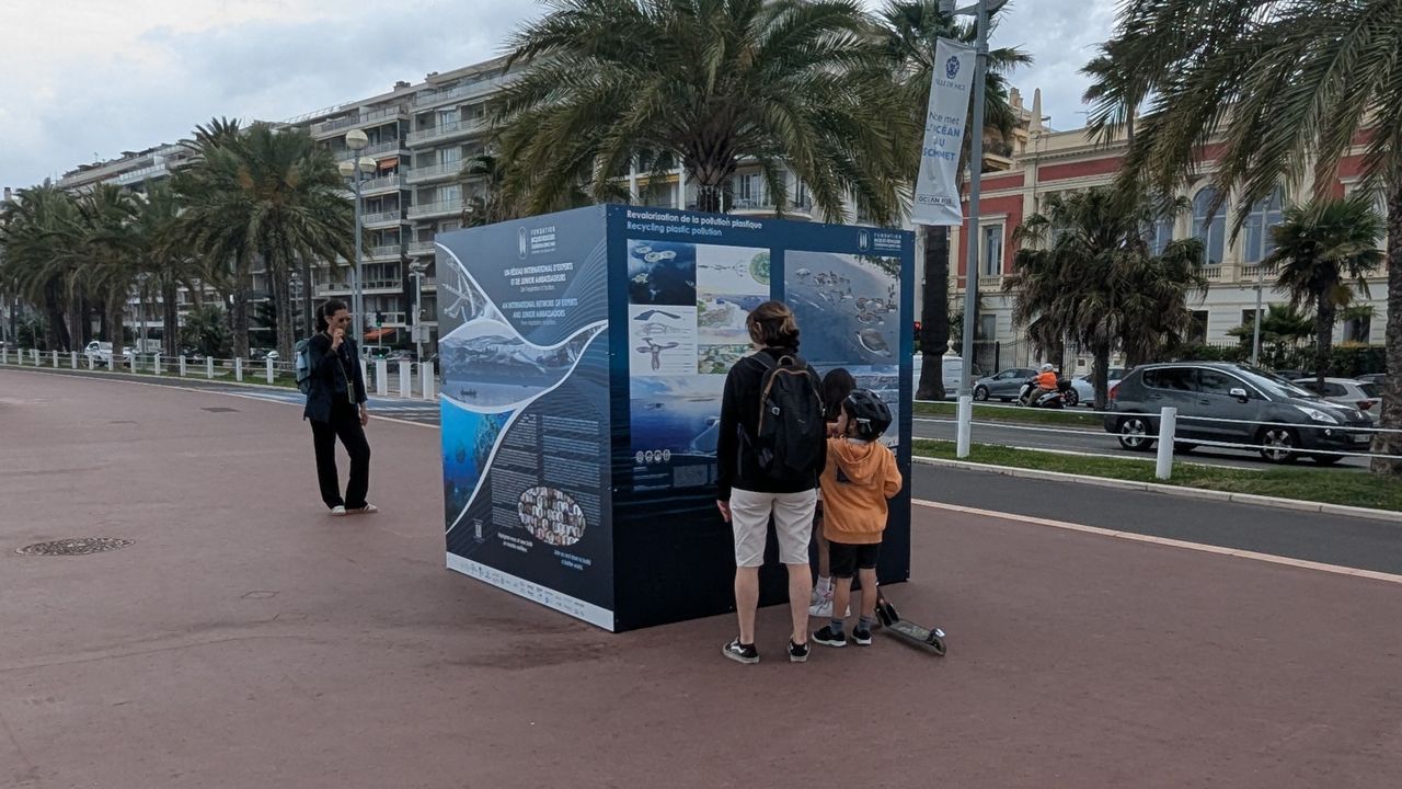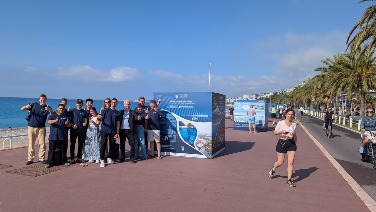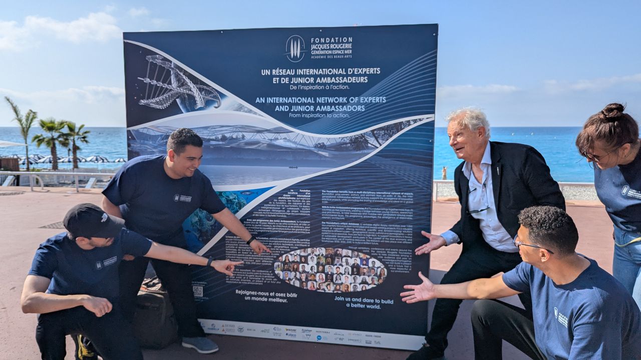 As part of the United Nations Ocean Conference in Nice, the Junior Ambassadors of the Fondation Jacques Rougerie – Académie des beaux-arts had the pleasure of discovering their own projects exhibited on the iconic Promenade des Anglais, right in front of the Mediterranean University Center.