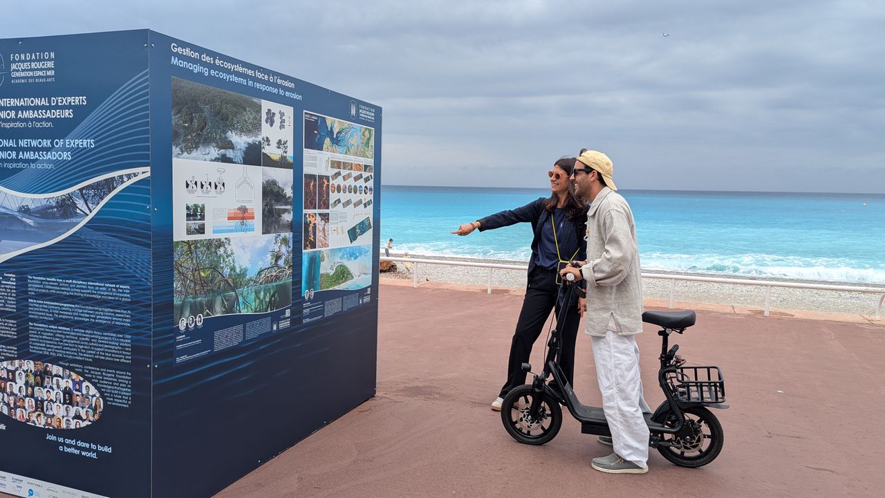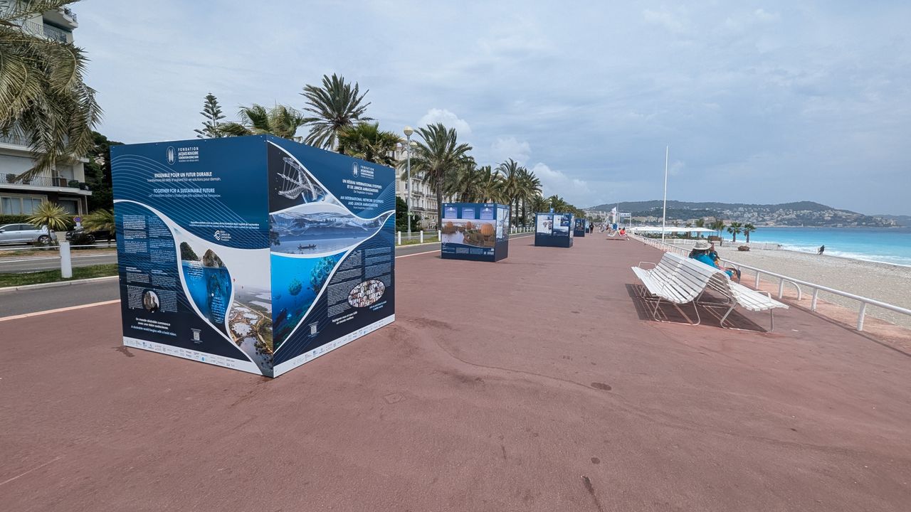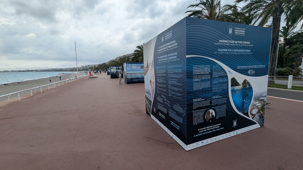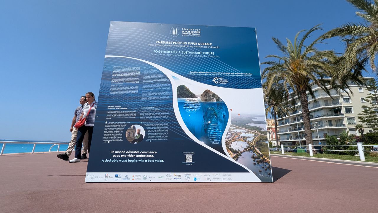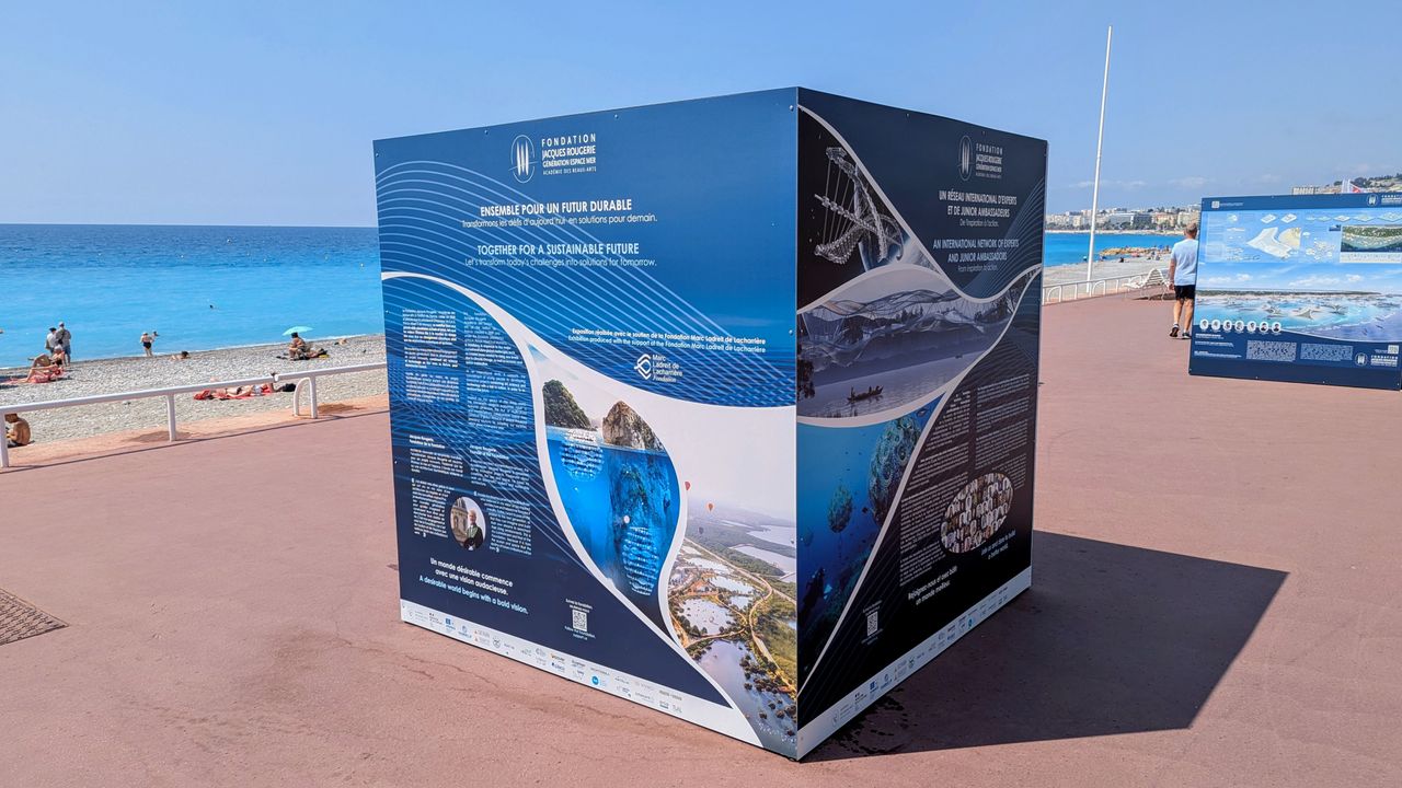 As part of the United Nations Ocean Conference in Nice, the Junior Ambassadors of the Fondation Jacques Rougerie – Académie des beaux-arts had the pleasure of discovering their own projects exhibited on the iconic Promenade des Anglais, right in front of the Mediterranean University Center.