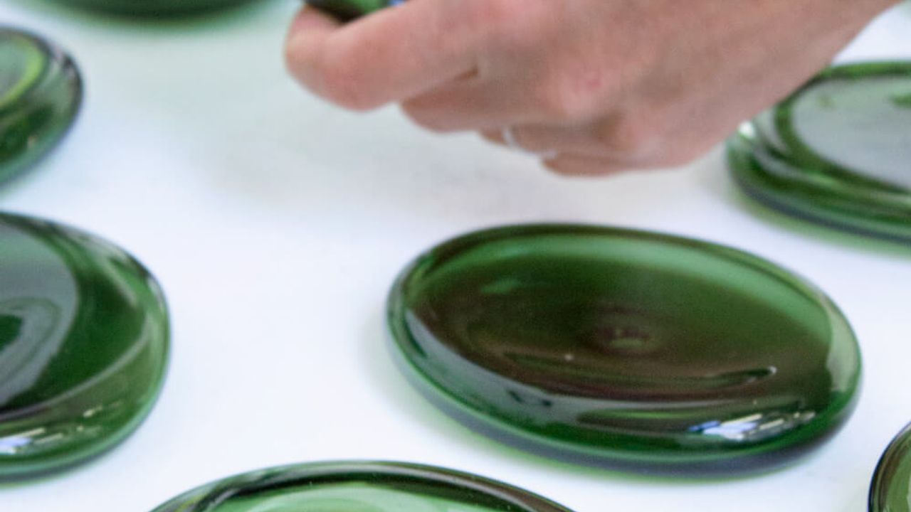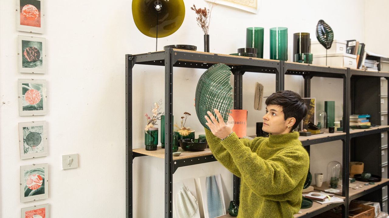 Depuis 2014, Lucile Viaud développe un travail de recherche plastique autour de l’eau, des littoraux et des ressources marines. Elle invente le verre marin Glaz — du vieux breton glas, nuance située entre le vert et le bleu pour décrire les couleurs changeantes de la mer en Bretagne — à partir de microalgues et de coproduits coquillers, notamment des coquilles d’huîtres et d’ormeaux.